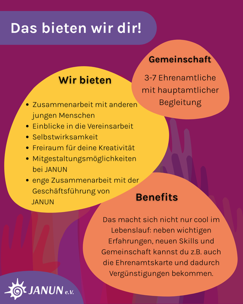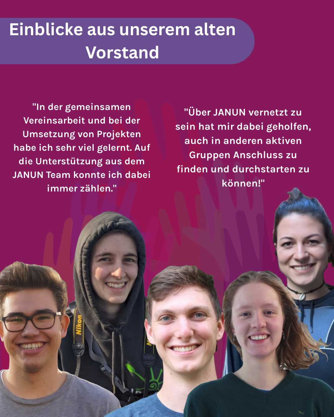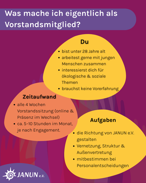 Mehr Infos über unseren Vorstand findest du auf den Bilder unten. Bei Interesse oder noch Fragen melde dich sehr gerne bei vorstand@janun.de.