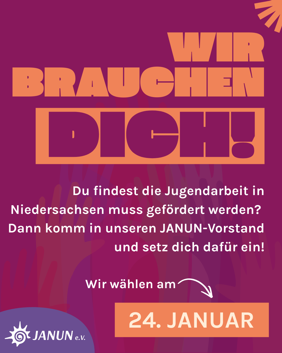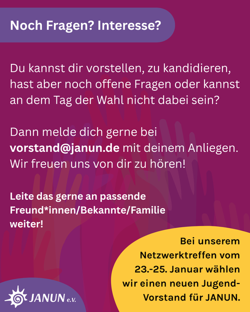 Wir wählen 2026 wieder einen neuen Vorstand für JANUN e.V., auf unserem Januar KoRa und Deli. Dieses Netzwerktreffen findet vom 23.-25. Januar im Naturfreundehaus Hannover statt.