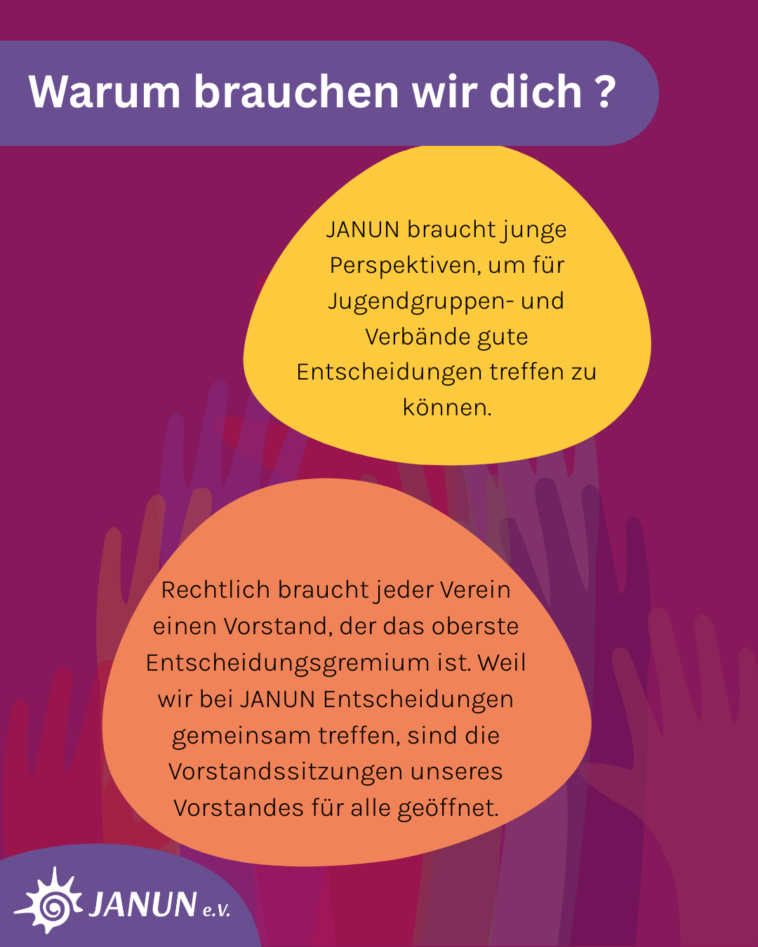 Rechtlich braucht jeder Verein einen Vorstand, der das oberste Entscheidungsgremium ist. Weil wir bei JANUN Entscheidungen gemeinsam treffen, sind die Vorstandssitzungen unseres Vorstandes für alle geöffnet.