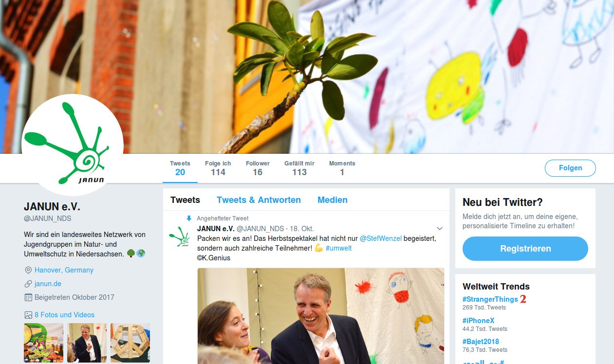 Da immer mehr junge Menschen gut über Instagram zu erreichen sind, werden hier seit kurzem auch Fotos aus dem Netzwerk hochgeladen (@janun_nds). Auch ein neuer Twitter-Account ist angelegt (ebenfalls @janun_nds), so können nun kurze Nachrichten und Mitteilungen schnell an ein großes Publikum geschrieben werden. Dieser läuft langsam an, etwa Umweltminister Stefan Wenzel verfolgt nun die Tweets von JANUN.