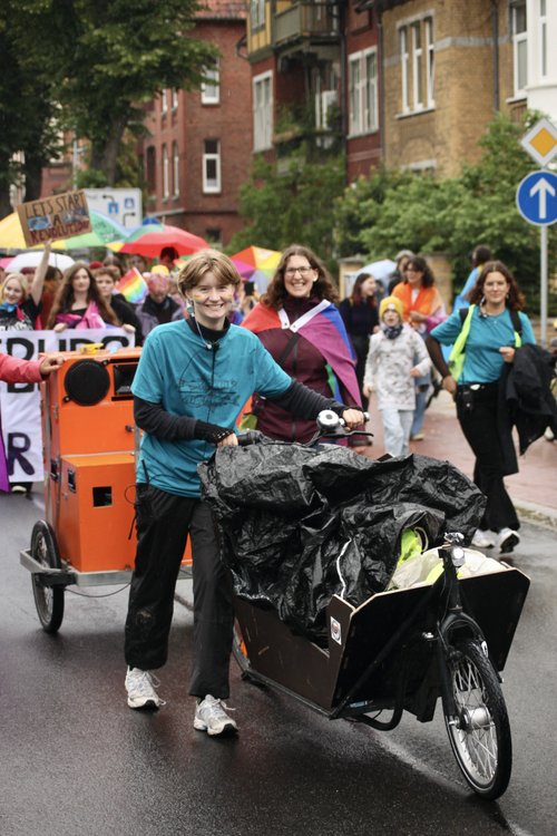 Dem Soundkarren ist das Wetter tatsächlich ziemlich egal. Ob bei der knallenden Sonne auf der Critical Mass, bei den auf die Pride prasselnden Regenschauern oder Kälte und Schneematsch--Sound braucht es immer.