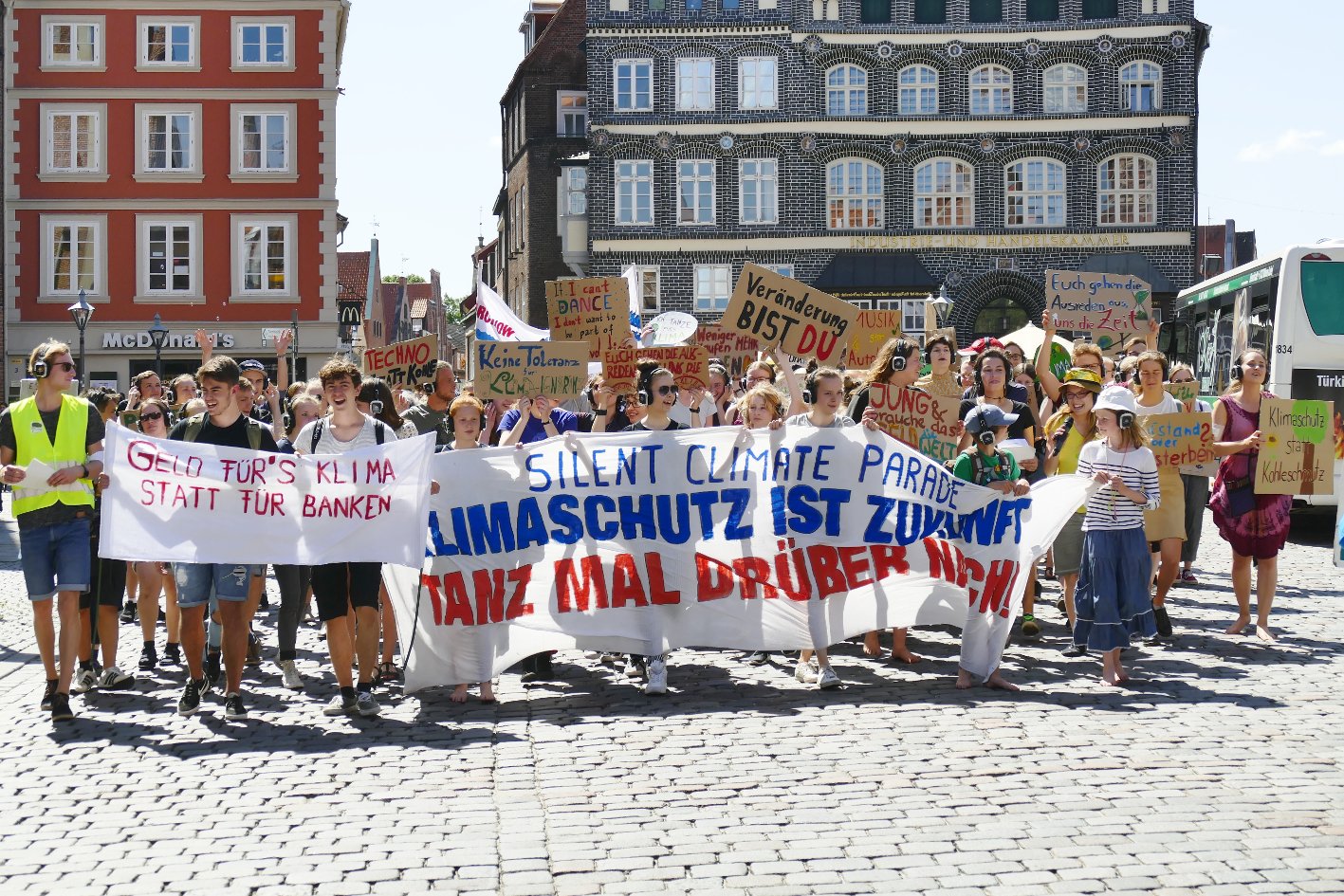 Die Masse setzt sich in Bewegung und zieht zum zentralen Platz „Am Sande“. Alle tragen Kopfhörer und hören Musik. Alle tanzen. Doch nach außen hin ist es still. Plötzlich eine Drehung. Sie gehen in die Hocke und wieder nach oben. Eine kleine Choreografie. Sie rufen: „Was wollen wir? Klimagerechtigkeit! Wann wollen wir die? Jetzt!“ Lachend zieht die Demonstration weiter. Vor dem Rathaus am Marktplatz hören sie auf zu tanzen. Sie bilden einen Kreis. Eine Geschichte wird dargestellt – ebenso still wie der Klimawandel. Über den Kopfhörer erhalten die Teilnehmer*innen die entsprechenden Regieanweisungen. Es funktioniert: Die Aktion zieht Aufmerksamkeit. Vorbeilaufende Passant*innen schauen interessiert zu; fragen nach. Sie erzählen von ihrem eigenen Engagement fürs Klima und bestärken die jungen Menschen in ihrem Handeln.