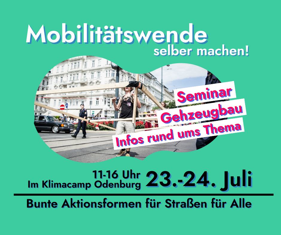 Ziel ist es, gemeinsam Gehzeuge zu bauen mit dem wir am Earth Overshoot Day aufzeigen wollen, dass die Städteplanung zu viel Platz den Autos überlässt. Mit den Gehzeugen wollen wir uns am 28. Juli ganz legal die Straßen Oldenburgs zurückerobern wollen. Denn: There is no planet B!